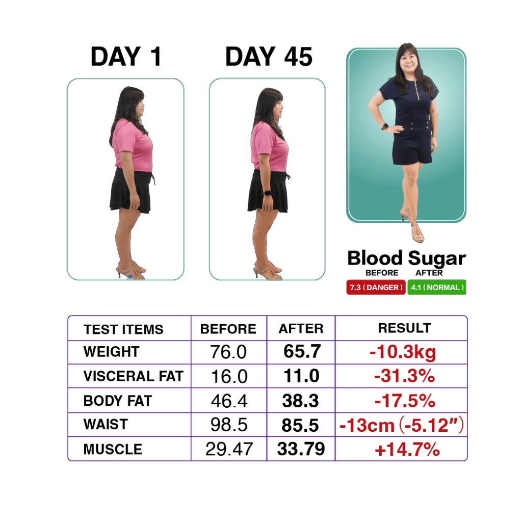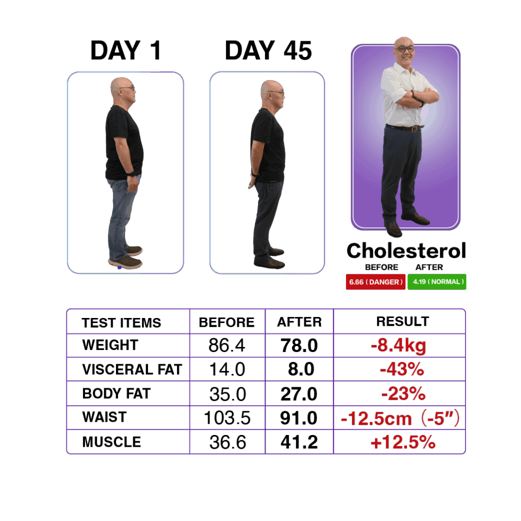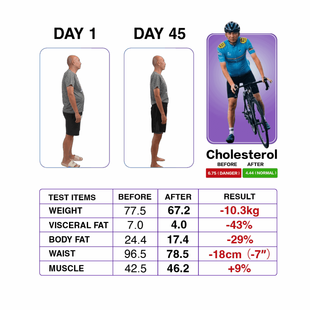 “A friend enrolled me in the CRP45 program. At first, I didn’t have high expectations, but I decided to give it a try anyway. I followed the guidance from my friendly coach, and soon, my body started to respond. By Day 45, my waistline had shrunk by 14.5 cm, my visceral fat dropped by 22%, and my fatty liver score went from danger to normal. I even gained muscle and felt stronger from the inside out. That was something truly amazing.”